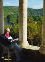 Bogens forside: Prins Henrik læser; landskabet mellem søjlerne.